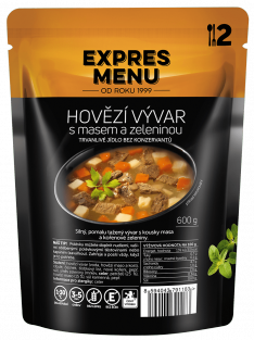 hovězí vývar (voda, hovězí maso a kosti, cibule, česnek, bobkový list, nové koření, pepř, sůl), směs zeleniny (mrkev, celer, petržel) (23 %), hovězí maso (15 %), sůl kamenná, pepř.